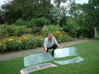 Pat Locker with three of the finished farina windscreens; enough were made for all four Farina Jupiters. |